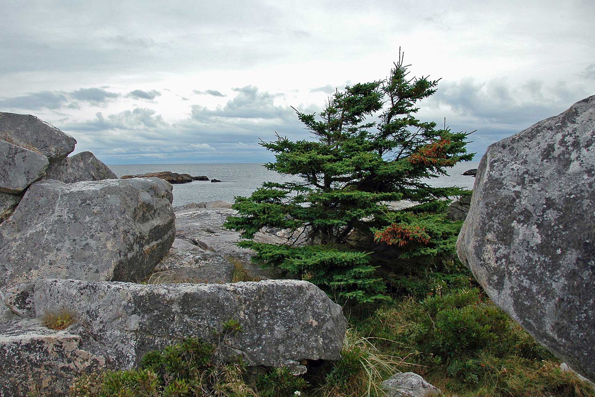 Lichen-Covered Rocks and Windblown Pine, Kejimkujik Seaside, Nova Scotia