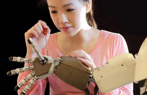 Woman adjusting robot hand. Peter Cade / Getty Images