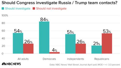 Still, a majority of Americans — 54 percent — believe that Congress should investigate whether there was contact between the Russian government and the Trump campaign, which is essentially unchanged from February’s NBC/WSJ poll.