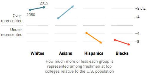 Even after decades of affirmative action, black and Hispanic students are more underrepresented at the nation’s top colleges and universities than they were 35 years ago, according to a New York Times analysis.