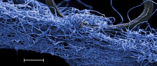 A scanning electron microscope image shows a nematode in biofilm (blue), in its natural deep-subsurface habitat. The scale bar is 20 micrometres (μm) long. All images courtesy Gaetan Borgonie