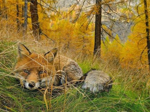 Gran Paradiso National Park, was once a royal hunting retreat. Here, a red fox lies in wait, camouflaged by the autumn woods. This photo was captured by Stefano Unterthiner.
