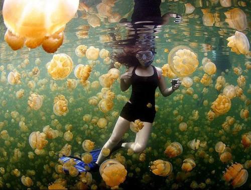 These golden jellyfish are harmless to humans, they spend much of their time following the sun as it moves across the sky. Sunlight for these jellyfish is essential. Captured by Ciemon Frank Caballes.