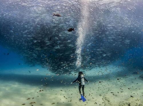 This young humpback whale was captured in the waters off Tonga. Karim Iliya writes that she ‘could not help but wave and smile at the newborn whale almost three times my length’ Curiosity got the better of it and emerging from under its mother’s fin, it swam toward me, approaching less than 30 centimetres (11 inches)