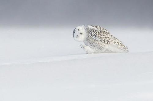 In this shot, photographed by Domnic Roy, a snowy owl appears to be fighting against the elements during extreme weather conditions near Quebec City, Canada.