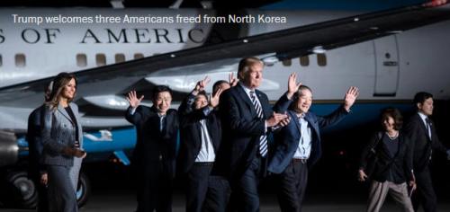 The plane carrying the three Americans pulled up in front of the giant flag. The president and first lady boarded the plane, while Pence, his wife, Karen, and Pompeo waited on the tarmac. Then Trump emerged followed by the three men, two of whom raised their arms in triumph and relief as they exited the plane.