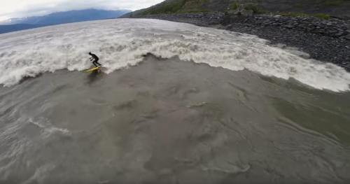 Aerial footage of surfers on the bore tide near Bird Point at Turnagain arm.