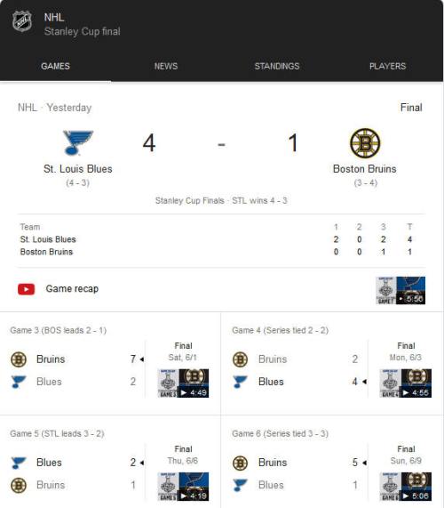 The Bruins may have entered with the upper hand, touting home ice after dropping four goals on Blues rookie goalie Jordan Binnington in a 5-1 Game 6 rout, but he stifled an early onslaught of offense to start Thursday’s showdown. That allowed St. Louis to hold a 2-0 lead after two periods despite taking only six of their own shots at the halfway point of the action. From that point forward, with Boston fans muzzled and the Bruins’ biggest names back in the shadows, St. Louis simply put on a clinic, demonstrating pitch-perfect checking, transition defense and penalty killing — all before a pair of third-period goals sealed their first title in franchise history.