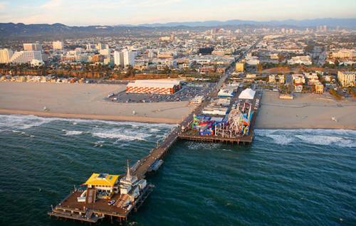 Santa Monica is a coastal city west of downtown Los Angeles. Santa Monica Beach is fringed by Palisades Park, with views over the Pacific Ocean. Santa Monica Pier is home to the Pacific Park amusement park, historic Looff Hippodrome Carousel and Santa Monica Pier Aquarium. Next to the pier is Muscle Beach, an outdoor gym established in the 1930s. In the city center, Bergamot Station houses several art galleries.