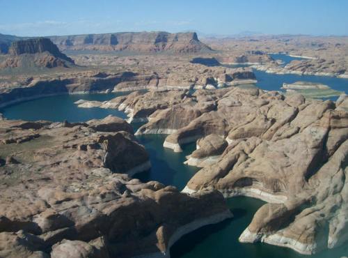 Lake Powell is a reservoir on the Colorado River, straddling the border between Utah and Arizona, United States. Most of Lake Powell, along with Rainbow Bridge National Monument, is located in Utah. It is a major vacation spot that around two million people visit every year.