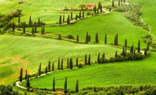 An image of Winding Road Across Rolling Hills In Tuscany, Italy