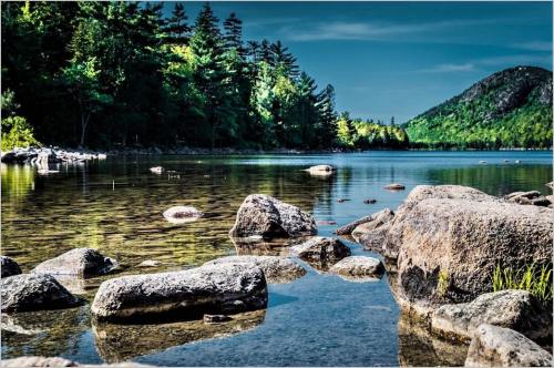 The pond was formed by the Wisconsin Ice Sheet during the last glacial period. Penobscot Mountain (1194 ft) rises to the west, while Pemetic Mountain (1247 ft) rises to the east. Two Roche moutonnées known as The Bubbles (North and South) rise above the northeastern shoreline. The southern end is constrained by glacial debris and an artificial dam.