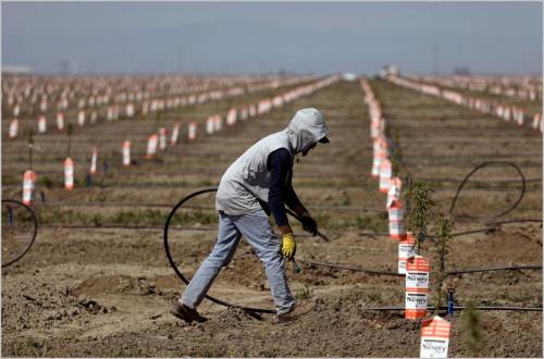 Irrigation lines are set up to water almond tree rootstocks in Tulare, California, on April 21.