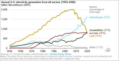 In 2020, renewable energy sources (including wind, hydroelectric, solar, biomass, and geothermal energy) generated a record 834 billion kilowatt-hours (kWh) of electricity or about 21% of all the electricity generated in the United States. Only natural gas (1,617 billion kWh) produced more electricity than renewables in the United States in 2020. Renewables surpassed both nuclear (790 billion kWh) and coal (774 billion kWh) for the first time on record. This outcome in 2020 was due mostly to significantly less coal use in U.S. electricity generation and steadily increased use of wind and solar.