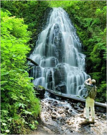 Fairy Falls is a 20-foot waterfall on the Oregon side of the Columbia River Gorge in the United States. As part of a tributary of Wahkeena Creek, Fairy Falls is located upstream from the much larger Wahkeena Falls. While small, this fan-shaped waterfall is a destination for photographers, mainly because of the scenic view. The creek cascades through a mossy rock slide lined with ferns, until rocky ledges of basalt break the water into various lacy streams. Wikipedia