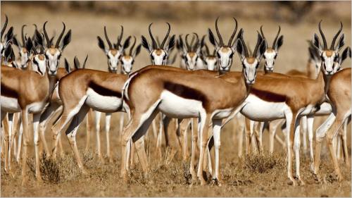 One widely familiar gazelle is the African species Thomson’s gazelle (Eudorcas thomsoni), which is around 60 to 70 cm (24 to 28 in) in height at the shoulder and is coloured brown and white with a distinguishing black stripe. The males have long, often curved, horns. Like many other prey species, Tommies and springboks (as they are familiarly called) exhibit a distinctive behaviour of stotting (running and jumping high before fleeing) when they are threatened by predators, such as cheetahs, lions, African wild dogs, crocodiles, hyenas, and leopards.