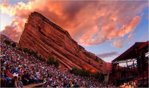 Red Rocks Amphitheatre is an open-air amphitheater built into a rock structure in the western United States, near Morrison, Colorado, ten miles (16 km) west of Denver. There is a large, tilted, disc-shaped rock behind the stage, a huge vertical rock angled outwards from stage right, several large outcrops angled outwards from stage left, and a seating area for up to 9,525.