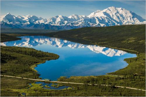 Denali National Park and Preserve, formerly known as Mount McKinley National Park, is an American national park and preserve located in Interior Alaska, centered on Denali, the highest mountain in North America. The park and contiguous preserve encompass 6,045,153 acres (9,446 sq mi; 24,464 km2) which is larger than the state of New Hampshire. On December 2, 1980, 2,146,580-acre (3,354 sq mi; 8,687 km2) Denali Wilderness was established within the park. Denali’s landscape is a mix of forest at the lowest elevations, including deciduous taiga, with tundra at middle elevations, and glaciers, snow, and bare rock at the highest elevations. The longest glacier is the Kahiltna Glacier. Wintertime activities include dog sledding, cross-country skiing, and snowmobiling. The park received 594,660 recreational visitors in 2018.