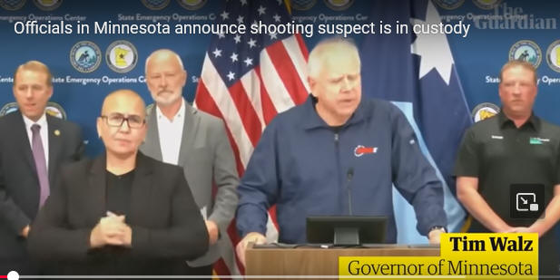 The man suspected of opening fire on two Minnesota legislators and their spouses on 14 June, killing one legislator and her husband, was apprehended late on Sunday night and charged with two counts of murder and two of attempted murder, the state’s governor, Tim Walz, said at a news conference.
