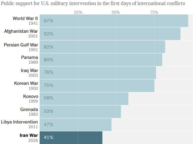 But even the highest level of public support for this conflict falls far lower than that at the start of most other conflicts, including World War II, the Korean War, and the Iraq War.