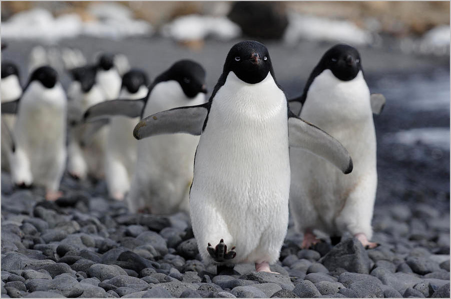 The Adélie penguin is a species of penguin common along the entire coast of the Antarctic continent, which is its only habitat. It is the most widely spread penguin species, as well as the most southerly distributed of all penguins, along with the emperor penguin. It is named after Adélie Land, in turn, named for Adèle Dumont d’Urville, who was married to French explorer Jules Dumont d’Urville, who first discovered this penguin in 1840. Adélie penguins obtain their food by both predation and foraging, with a diet of mainly krill and fish. The Adélie penguin is one of three species in the genus Pygoscelis. Mitochondrial and nuclear DNA evidence suggests the genus split from other penguin species around 38 million years ago, about 2 million years after the ancestors of the genus Aptenodytes. In turn, the Adélie penguins split off from the other members of the genus around 19 million years ago.