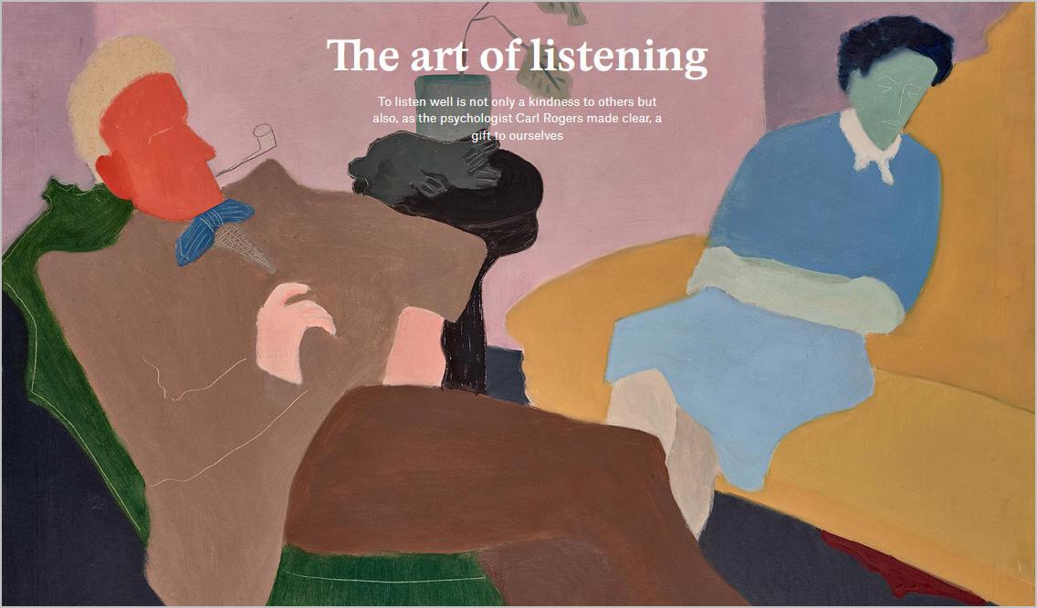 Along the way, I discovered that Carl Rogers, one of the 20th century’s most eminent psychologists, had put a name to this underrated skill: ‘active listening’. And though Rogers’s work was focused initially on the therapeutic setting, he drew no distinction between this and everyday life: ‘Whatever I have learned,’ he wrote, ‘is applicable to all of my human relationships.’ What Rogers learned was that listening well – which necessarily involves conversing well and questioning well – is one of the most accessible and most powerful forms of connection we have.