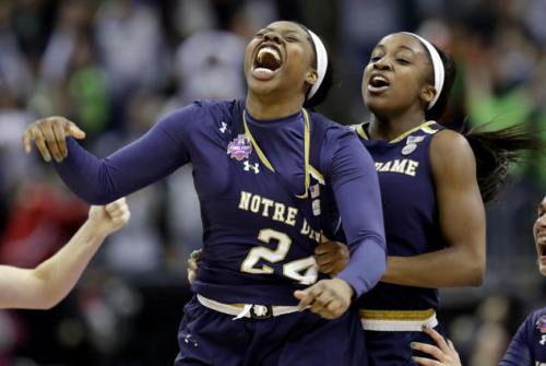 Notre Dame’s Arike Ogunbowale, left, celebrates after hitting the game-winning shot for the second time in three nights. (Tony Dejak/Associated Press)