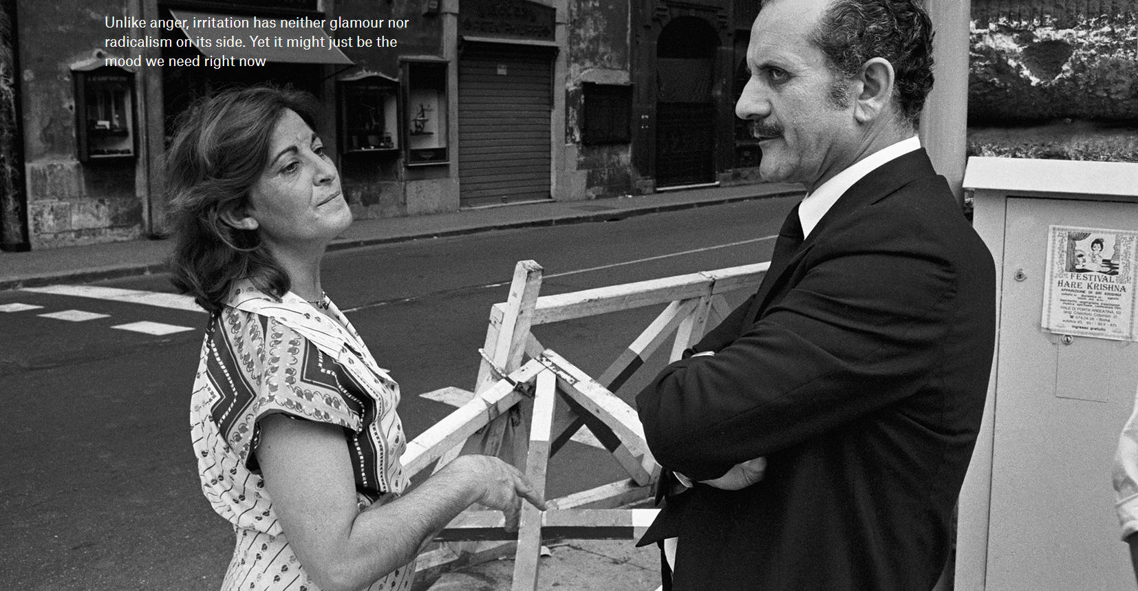 For Aristotle, irritation was closely related to anger. You might say that irritation is anger’s meaner little sibling – what, in Ugly Feelings (2007), the scholar Sianne Ngai calls ‘inadequate’ anger. One loses oneself in a rage – that is one of anger’s seductions: it offers a holiday from the self, that licenses acts ordinarily proscribed. To be irritated is to hover at anger’s threshold, while knowing its repertoire of decisive actions are inappropriate responses to the present situation. Communicated by huffs and sighs but rarely through more drastic measures, irritation is a feeling that’s expressed only through being inadequately expressed. One is not moved to commit appalling acts due to irritation. Nor is one permitted to do so: there are no ‘crimes of irritation’, no clemency for the irate.