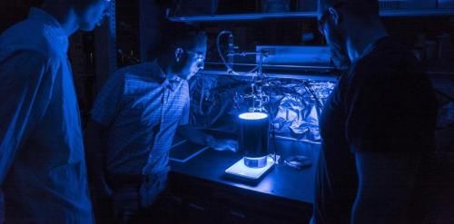 University of Central Florida Assistant Professor Fernando Uribe-Romo, center, has found a way to trigger the process of photosynthesis in a synthetic material. UCF