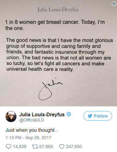 “1 in 8 women get breast cancer. Today, I’m the one,” her post read. “The good news is that I have the most glorious group of supportive and caring family and friends, and fantastic insurance through my union. The bad news is that not all women are so lucky, so let’s fight all cancers and make universal health care a reality.”