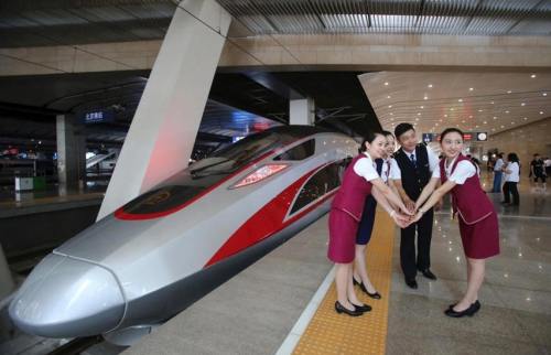 Railway workers pose next to one of China’s new bullet trains. Chinatopix Via AP