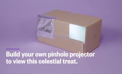 Here is a quick demo about how to build a pinhole projector to safely view a projection of the eclipsed sun. When looking at the eclipse directly, protective eclipse glasses are necessary to prevent eye damage.