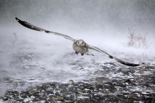 A seagull takes flight in high winds and blowing snow as a massive winter storm begins to bear down in Hull, Massachusetts on Jan. 4, 2018.