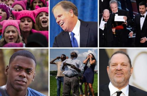 Clockwise from top left: The Women’s March on Washington; Sen.-elect Doug Jones; Jordan Horowitz, producer of “La La Land,” shows the envelope revealing “Moonlight” as the true winner of best picture at the Oscars; Harvey Weinstein; people in the District watch the solar eclipse; Daniel Kaluuya “Get Out.” (Clockwise from top left: Amanda Voisard for The Washington Post; John Bazemore/Associated Press; Chris Pizzello/Invision/Associated Press; Robyn Beck/Agence France-Presse/Getty Images; Bill O’Leary/The Washington Post; Universal Pictures)